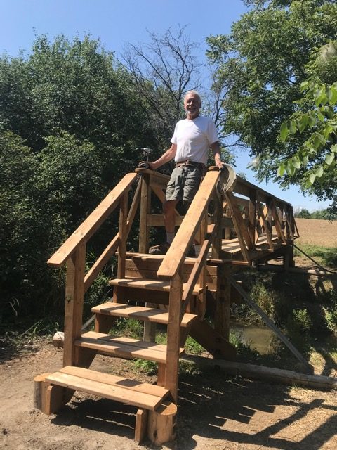 Eventually, on one very hot day in July 2020, the team assembled to build the bridge. About 8 hours of concentrated work were required. In the process, one of the team got injured by an auger and looked like he was about to go into shock, so I bundled him up and took him post-haste to Stratford Hospital Emergency Dept., where his bleeding finger was speedily attended to. I bought some turkey sandwiches from Timmes on the way back, and they proved to be a godsend to the sweating volunteers.